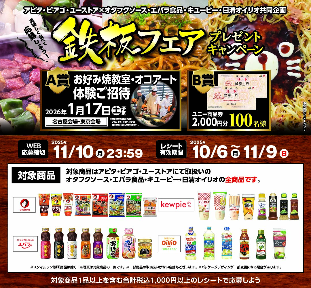 アピタ・ピアゴ・ユーストアにて取り扱いのオタフクソース・エバラ食品・キューピー・日清オイリオの全商品。