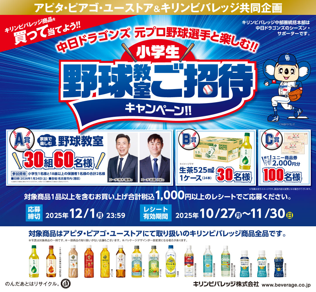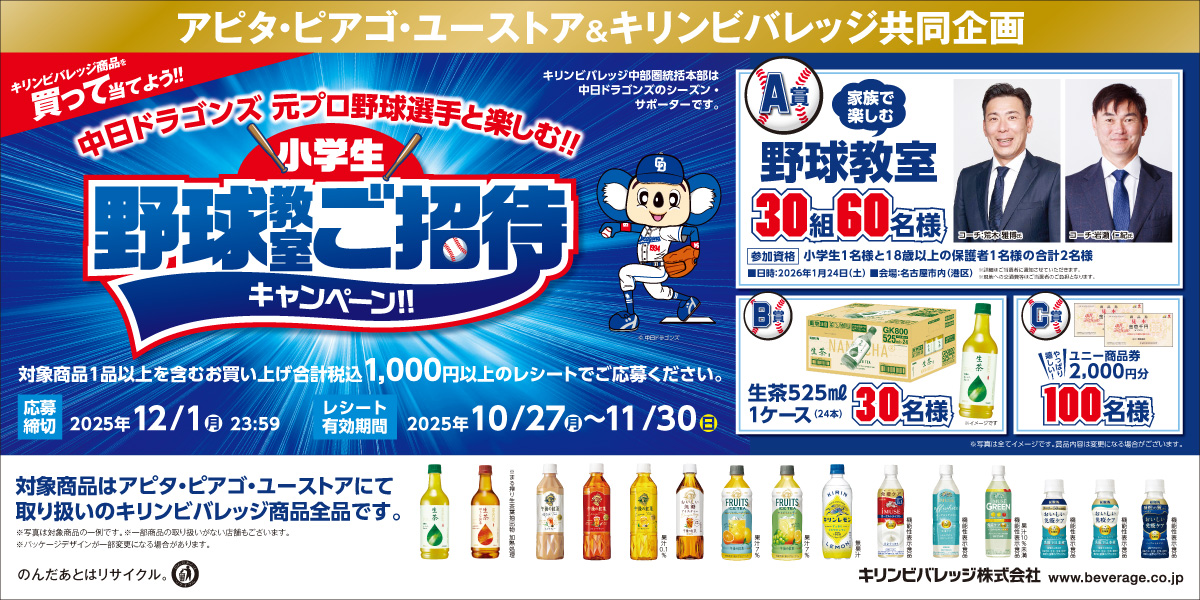 アピタ・ピアゴ・ユーストア直営売場にて取り扱いのキリンビバレッジ商品全品