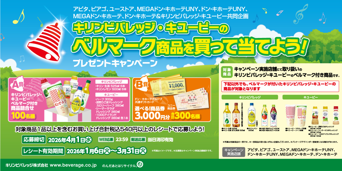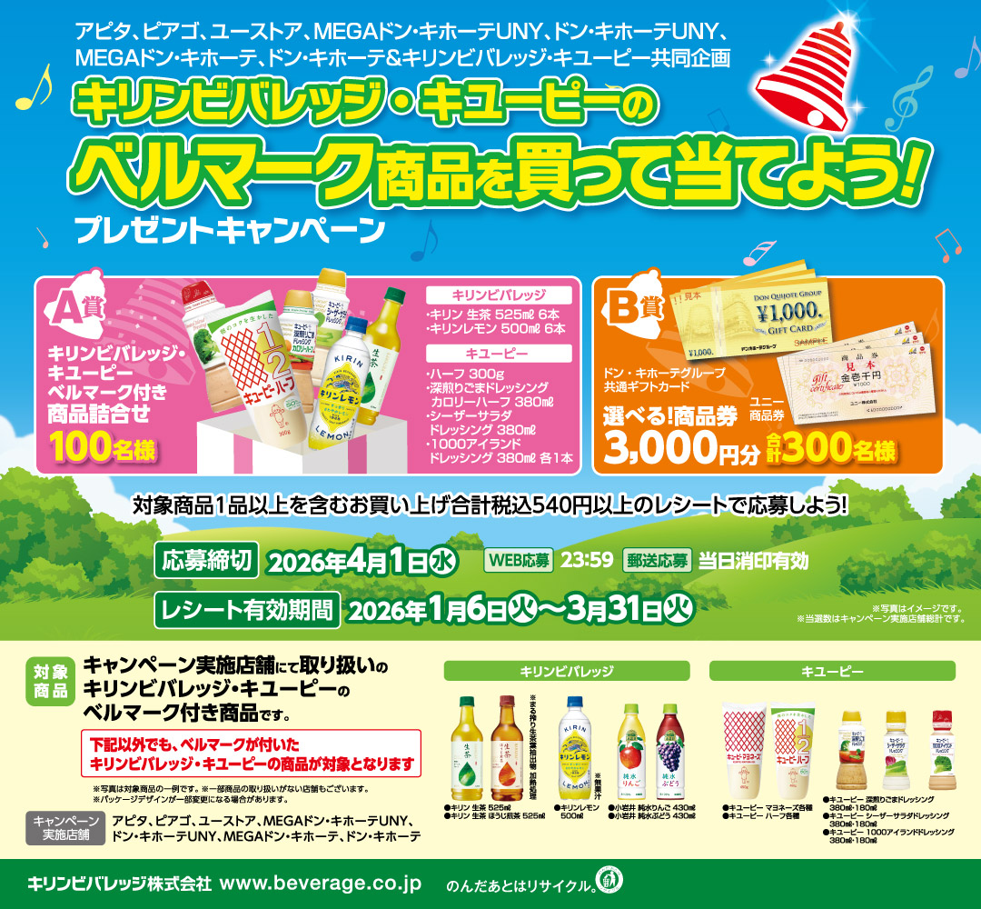 キャンペーン実施店舗にて取り扱いのキリンビバレッジ及びキユーピーのベルマーク付き商品