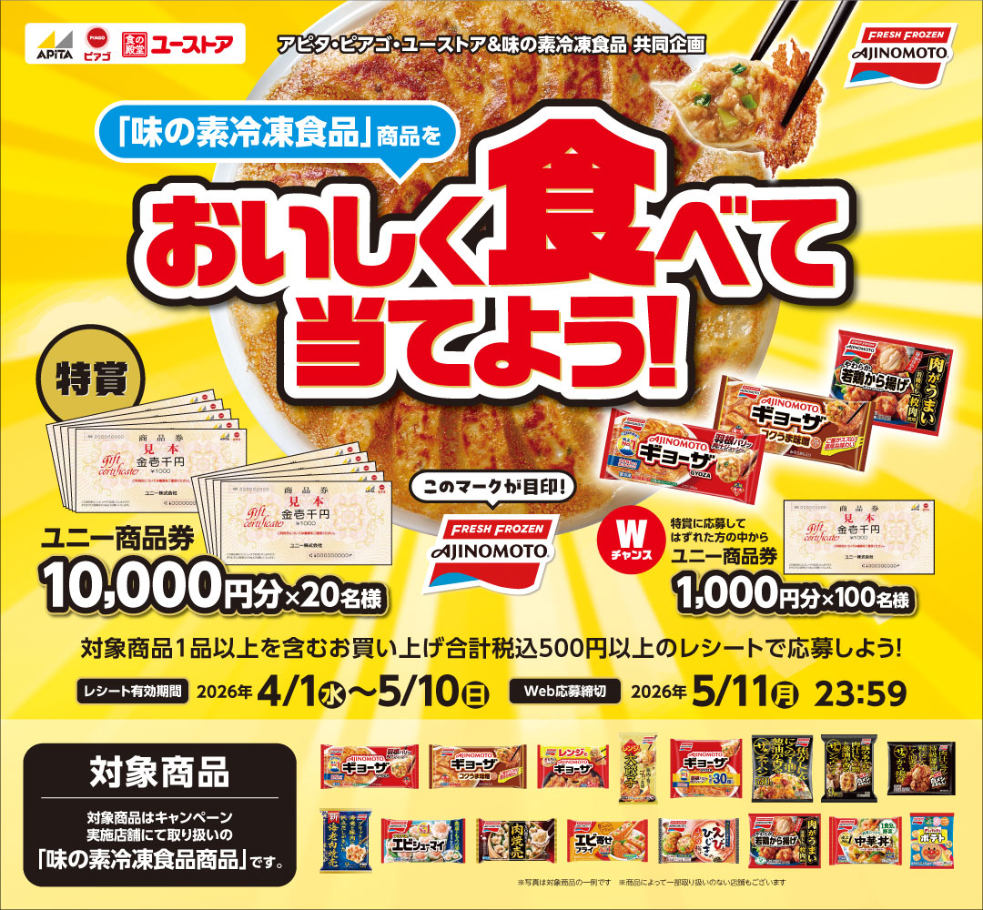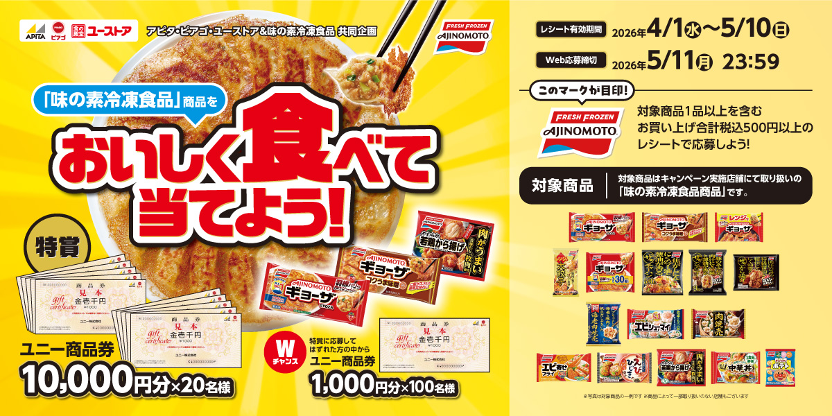 アピタ・ピアゴ・ユーストア直営売り場にて取り扱いの「味の素冷凍食品商品」です。